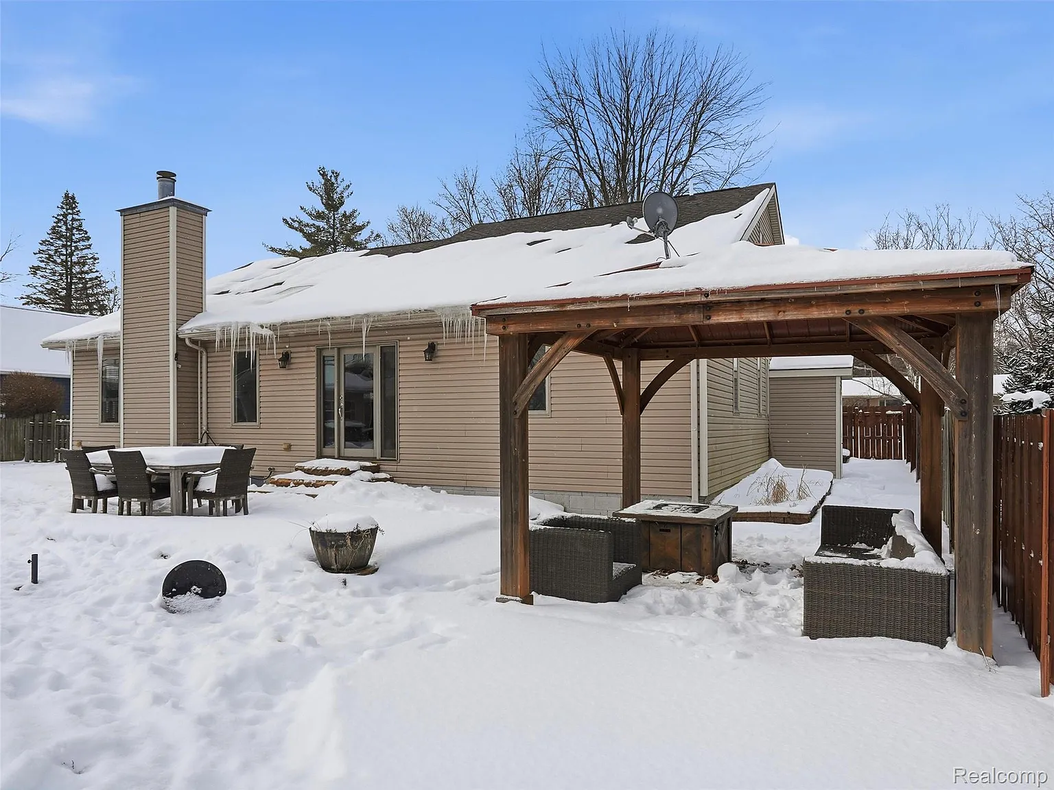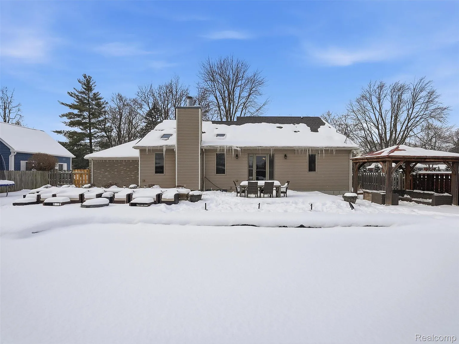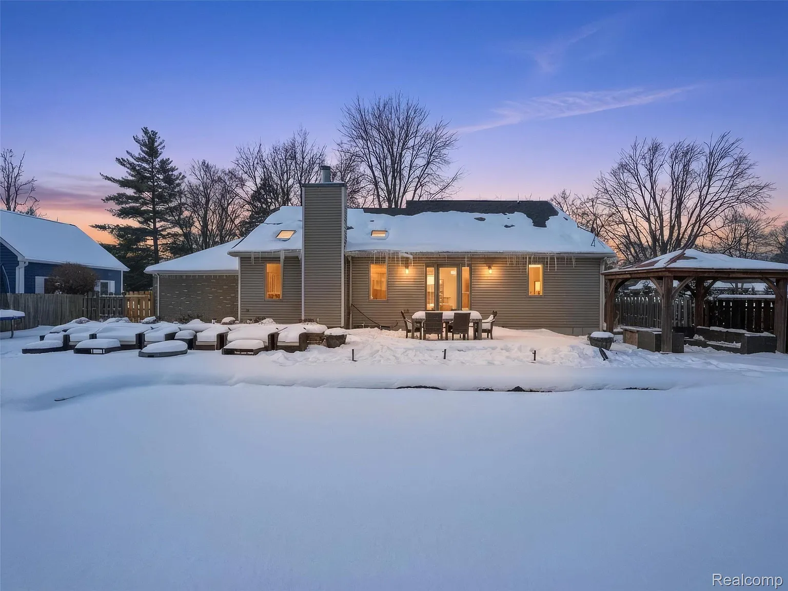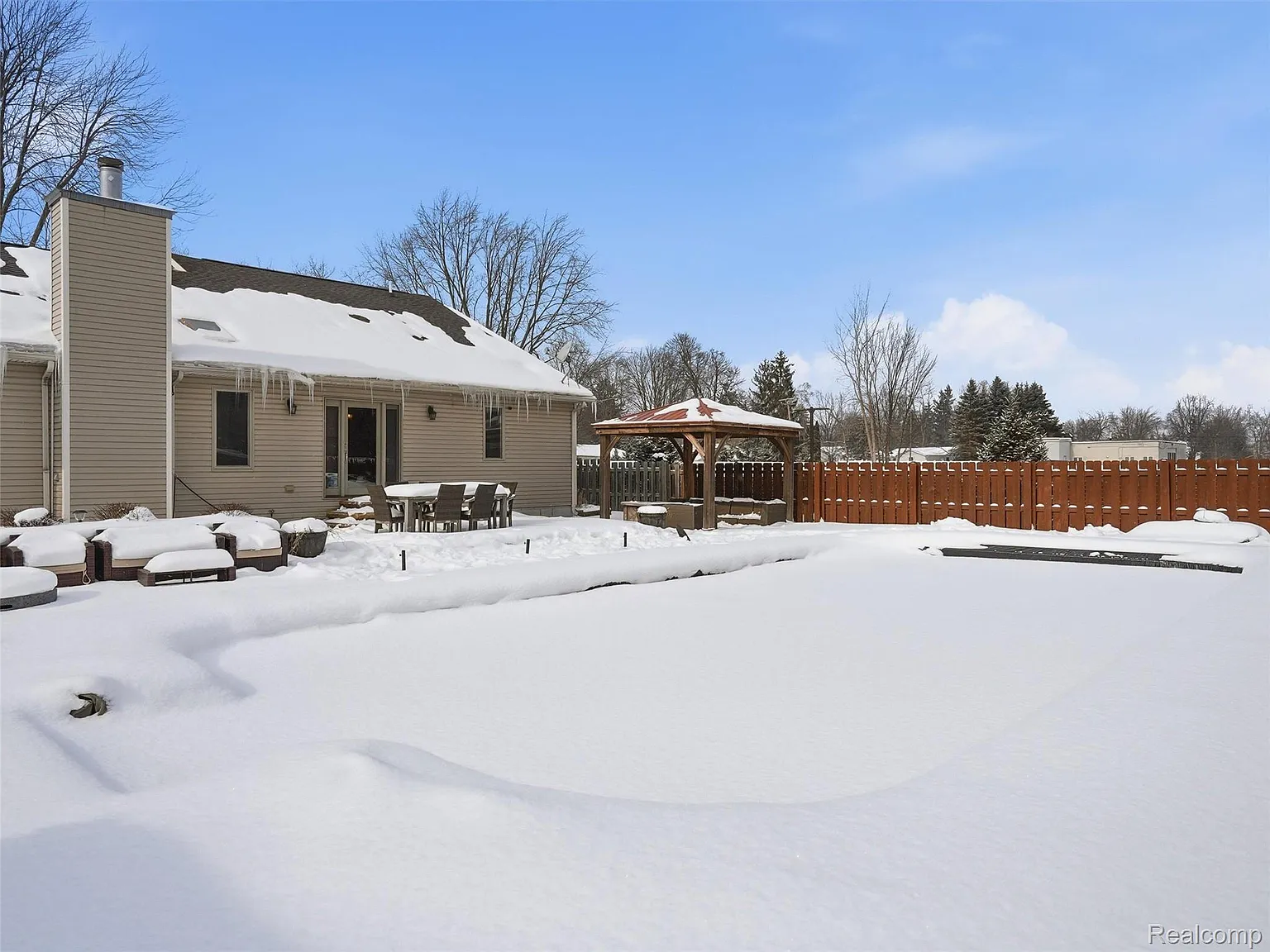 Welcome to this thoughtfully designed 4-bedroom, 3-full-bath home offering flexible living space, quality finishes, and resort-style outdoor amenities. A covered front porch with wood ceiling detail and ceiling fan leads into a light-filled interior featuring hardwood flooring throughout the main living areas and bedrooms, with ceramic tile in all bathrooms. The open layout flows seamlessly into the kitchen, appointed with granite countertops, stainless steel appliances, abundant cabinetry, and a center island. The adjacent dining area with glass patio door provides direct access to the backyard for easy indoor-outdoor living. The primary suite is privately positioned and features vaulted ceilings, skylights, a gas fireplace with stone surround, two walk-in closets, and a full en suite bath with granite countertops and tile finishes. Three additional bedrooms offer flexibility for family, guests, or home office use. A nearby full bath includes dual vanities, heated floors, and a Euro-style walk-in shower. An Unfinished Upper-Level Space (with full stair access) adds valuable flexibility and future potential for storage or finishing. The fully fenced backyard is designed for entertaining, with expansive stamped concrete defining multiple outdoor living areas. The centerpiece is a large in-ground saltwater pool with fountains and a newer heater, offering extended seasonal enjoyment. Additional features include a wooden gazebo, covered patio and dining area, outdoor kitchen setup, shed, exterior-access full bathroom with tile finishes, and an outdoor shower—a rare and highly convenient combination. An attached 2.5-car garage provides everyday convenience and additional storage. This home delivers a well-balanced layout and outdoor amenities rarely found together—designed for both everyday living and entertaining.