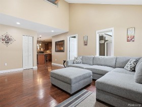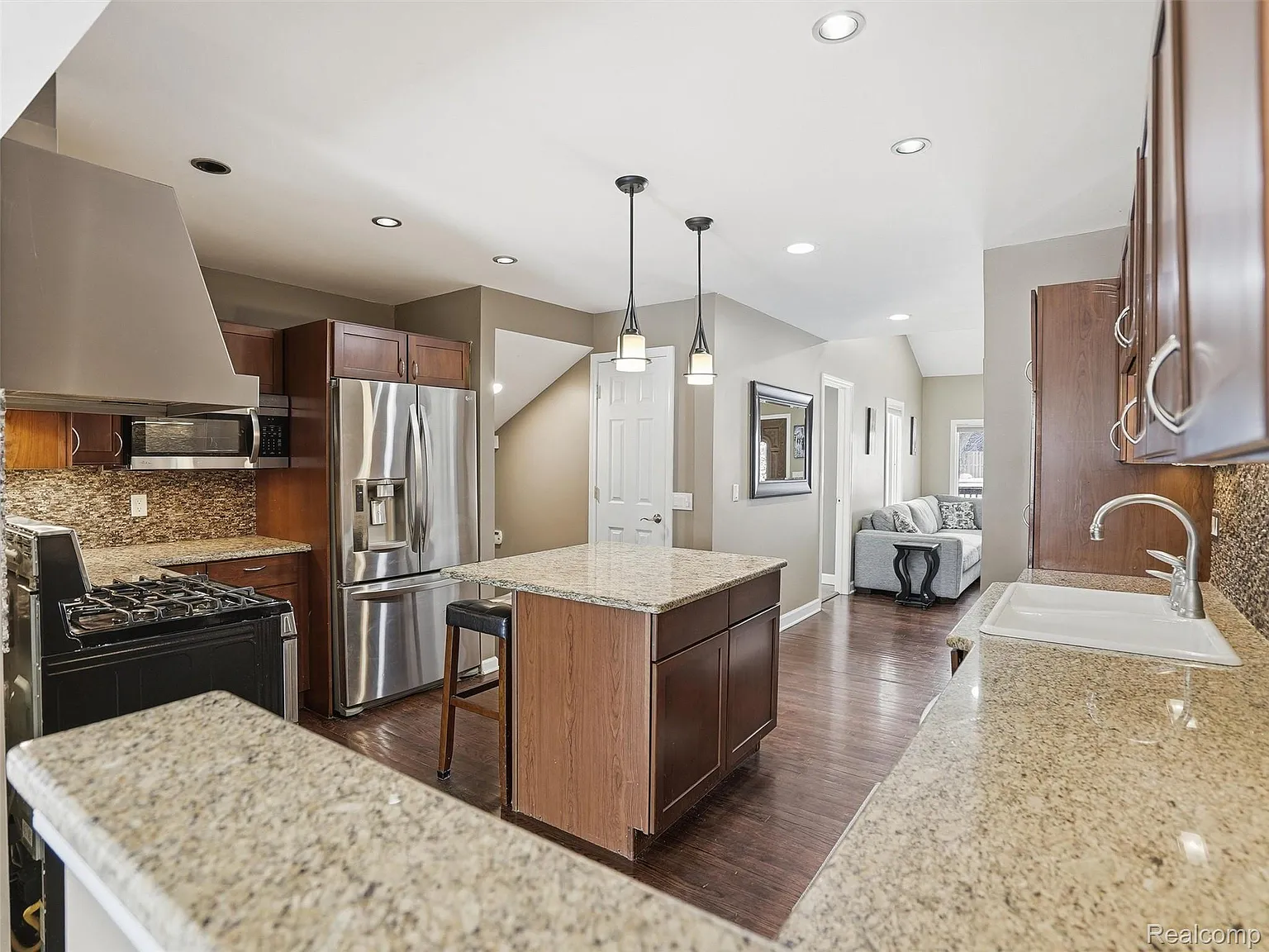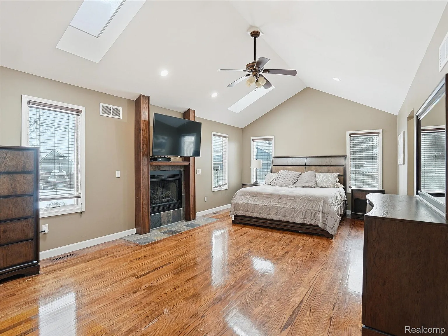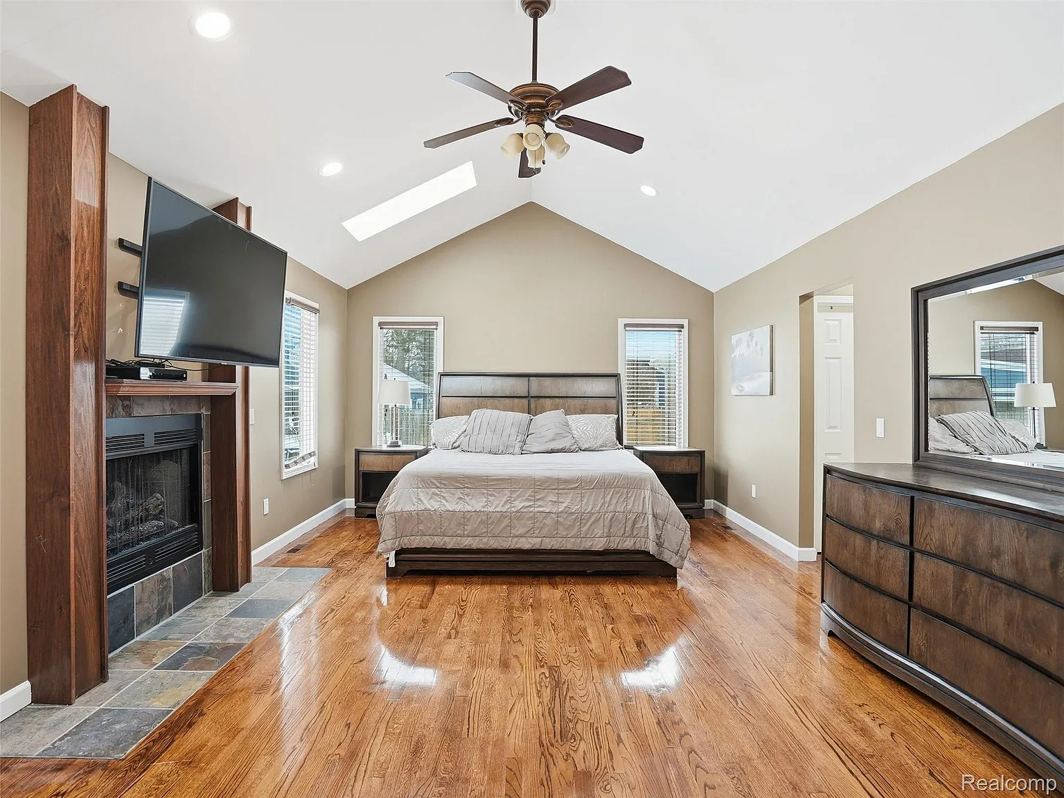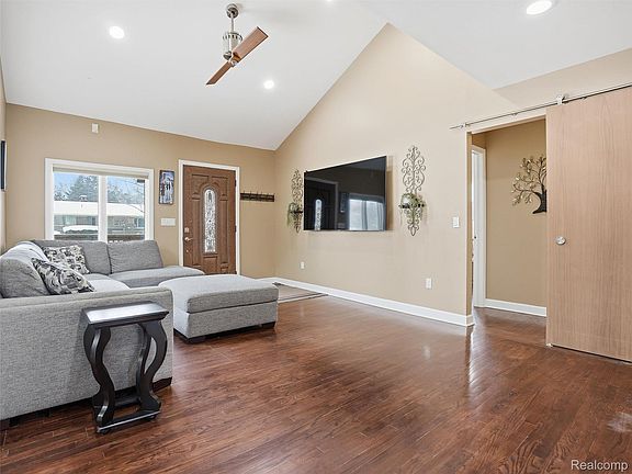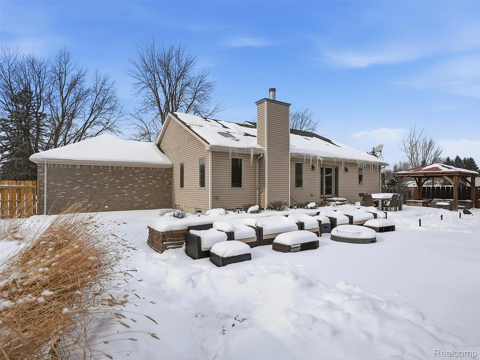 Welcome to this thoughtfully designed 4-bedroom, 3-full-bath home offering flexible living space, quality finishes, and resort-style outdoor amenities. A covered front porch with wood ceiling detail and ceiling fan leads into a light-filled interior featuring hardwood flooring throughout the main living areas and bedrooms, with ceramic tile in all bathrooms. The open layout flows seamlessly into the kitchen, appointed with granite countertops, stainless steel appliances, abundant cabinetry, and a center island. The adjacent dining area with glass patio door provides direct access to the backyard for easy indoor-outdoor living. The primary suite is privately positioned and features vaulted ceilings, skylights, a gas fireplace with stone surround, two walk-in closets, and a full en suite bath with granite countertops and tile finishes. Three additional bedrooms offer flexibility for family, guests, or home office use. A nearby full bath includes dual vanities, heated floors, and a Euro-style walk-in shower. An Unfinished Upper-Level Space (with full stair access) adds valuable flexibility and future potential for storage or finishing. The fully fenced backyard is designed for entertaining, with expansive stamped concrete defining multiple outdoor living areas. The centerpiece is a large in-ground saltwater pool with fountains and a newer heater, offering extended seasonal enjoyment. Additional features include a wooden gazebo, covered patio and dining area, outdoor kitchen setup, shed, exterior-access full bathroom with tile finishes, and an outdoor shower—a rare and highly convenient combination. An attached 2.5-car garage provides everyday convenience and additional storage. This home delivers a well-balanced layout and outdoor amenities rarely found together—designed for both everyday living and entertaining.
